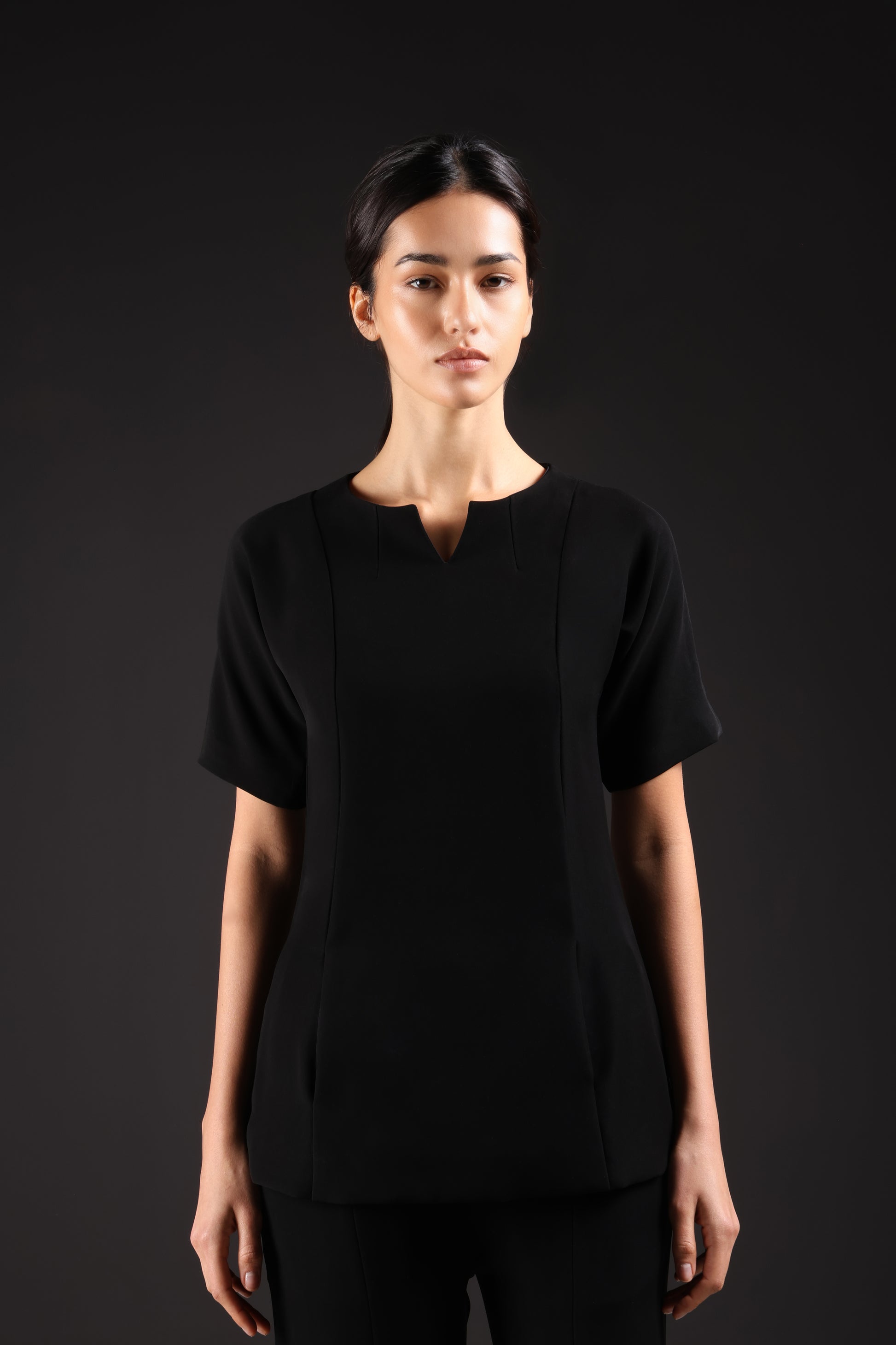 Designed for a flattering fit, this shirt features a shaped waist that enhances the silhouette. Discreet hidden pockets add functionality, while a subtle neckline opening adds a refined detail. Crafted for comfortable, effortless everyday wear.