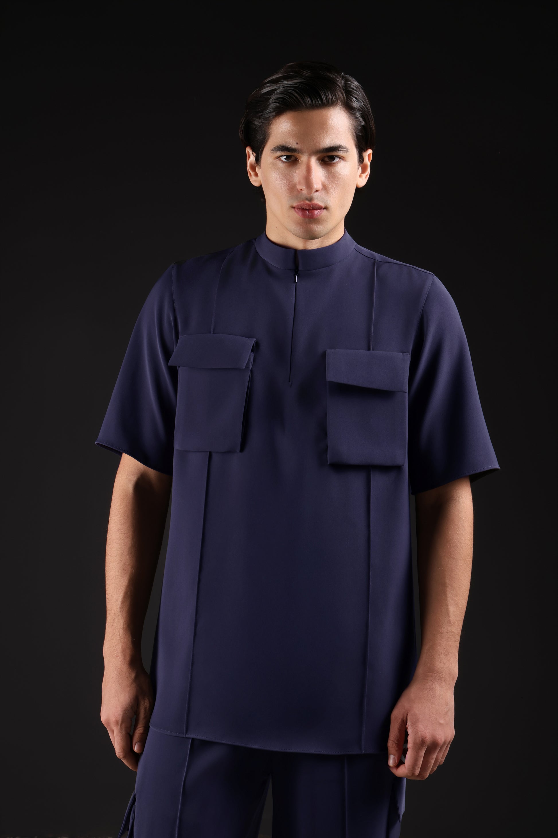 Casual and functional. The Cargo Shirt features two oversized front pockets, a subtle front zipper, and structured high collar. Made from soft, breathable fabric for all-day comfort and easy wear.