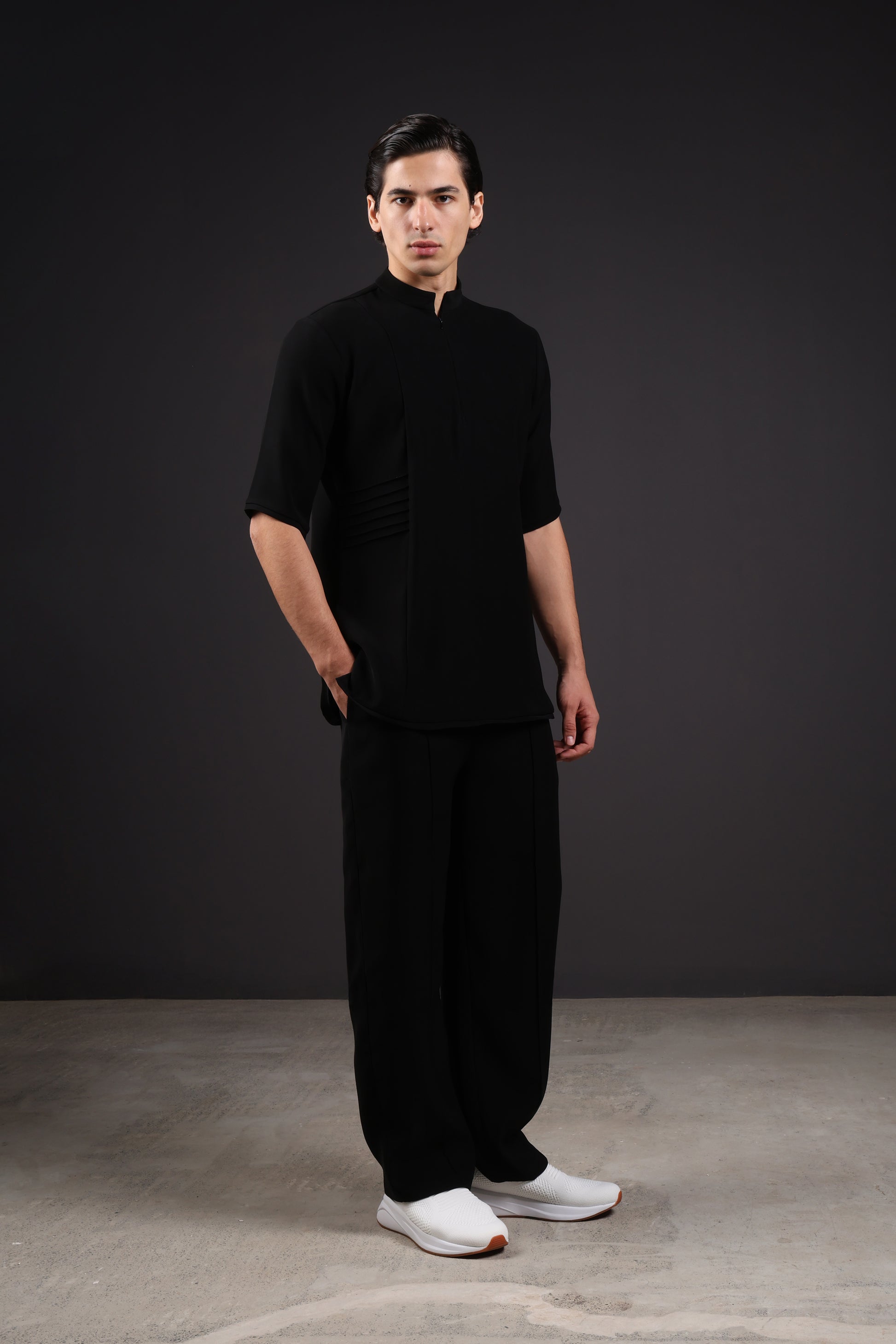 A modern essential with subtle edge. Detailed stitching along the sides and a small front zipper add dimension to a clean, easy-to-wear design, crafted from an exceptionally light and comfortable fabric.